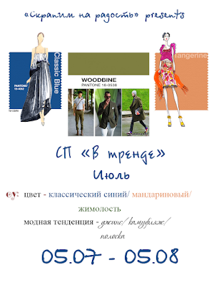 Итак, суть задания: Сделать любую скрап-работу, применив один из перечисленных выше цветов (классический синий, мандариновый, жимолость) и одну из модных тенденций (джинс, камуфляж, полоска )